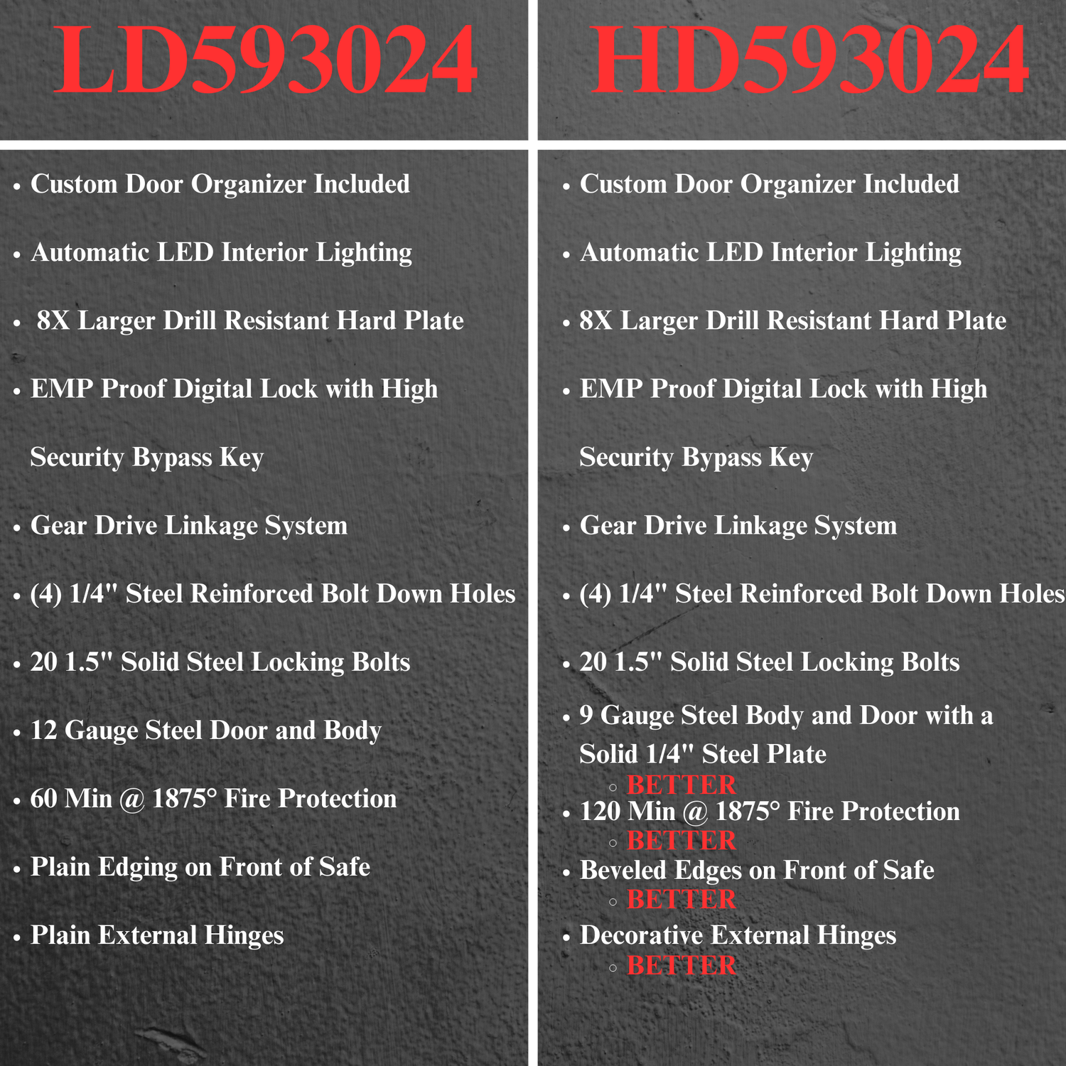 When upgrading from the LD593024 model to our Extreme Duty HD593024 model, you will gain double the fireproofing, considerably thicker steel, and some cosmetic improvements.