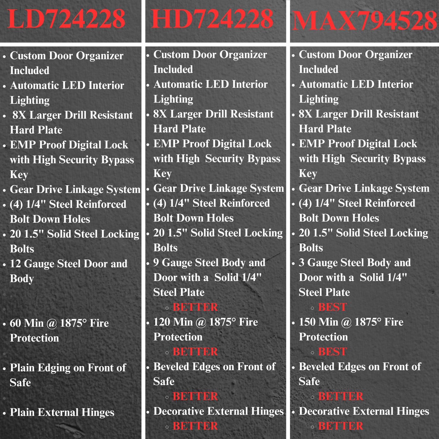 When upgrading from the LD724228 model to our Extreme Duty HD724228 model or MAX754528 you will gain double the fireproofing, considerably thicker steel, and some cosmetic improvements.