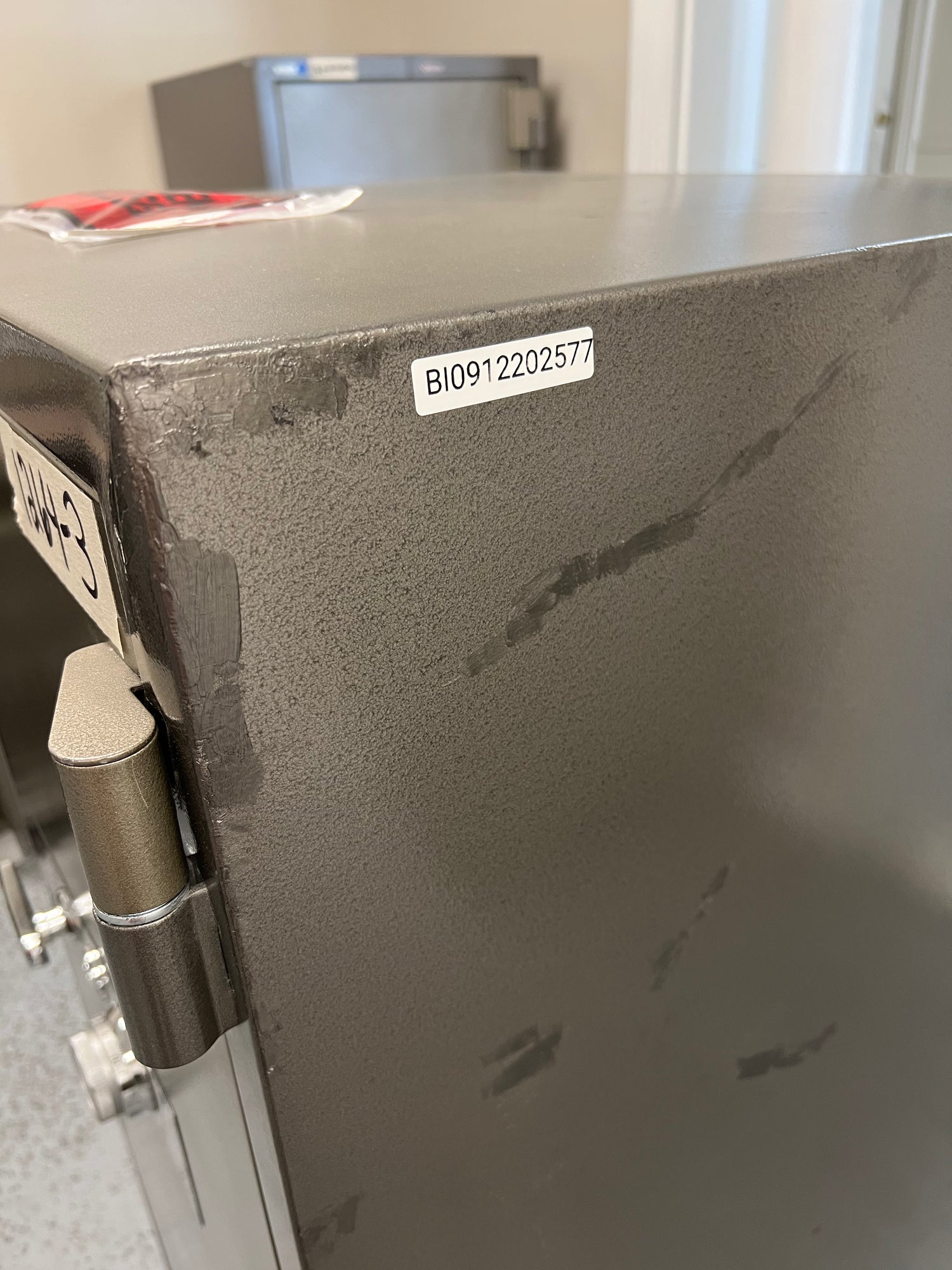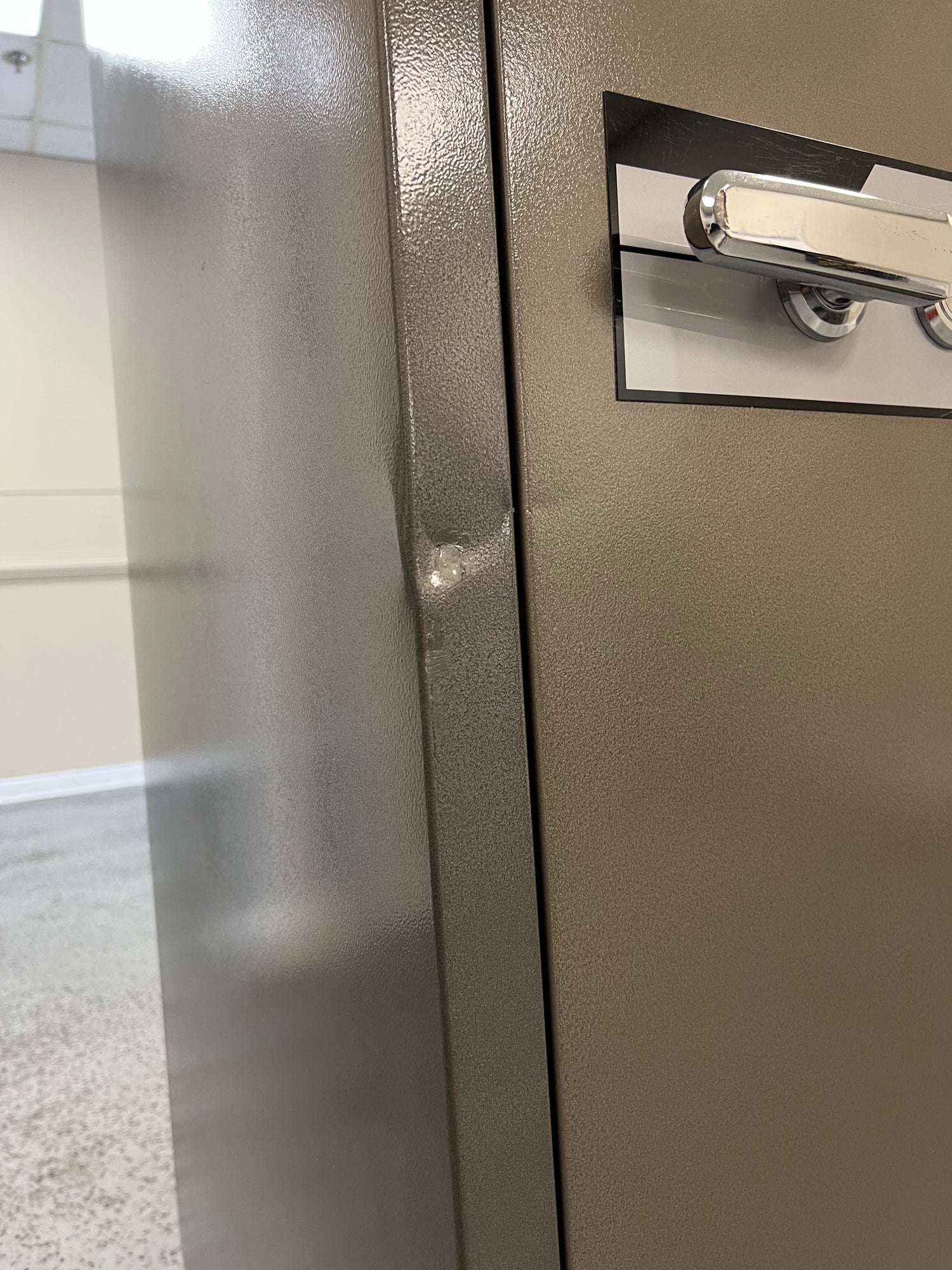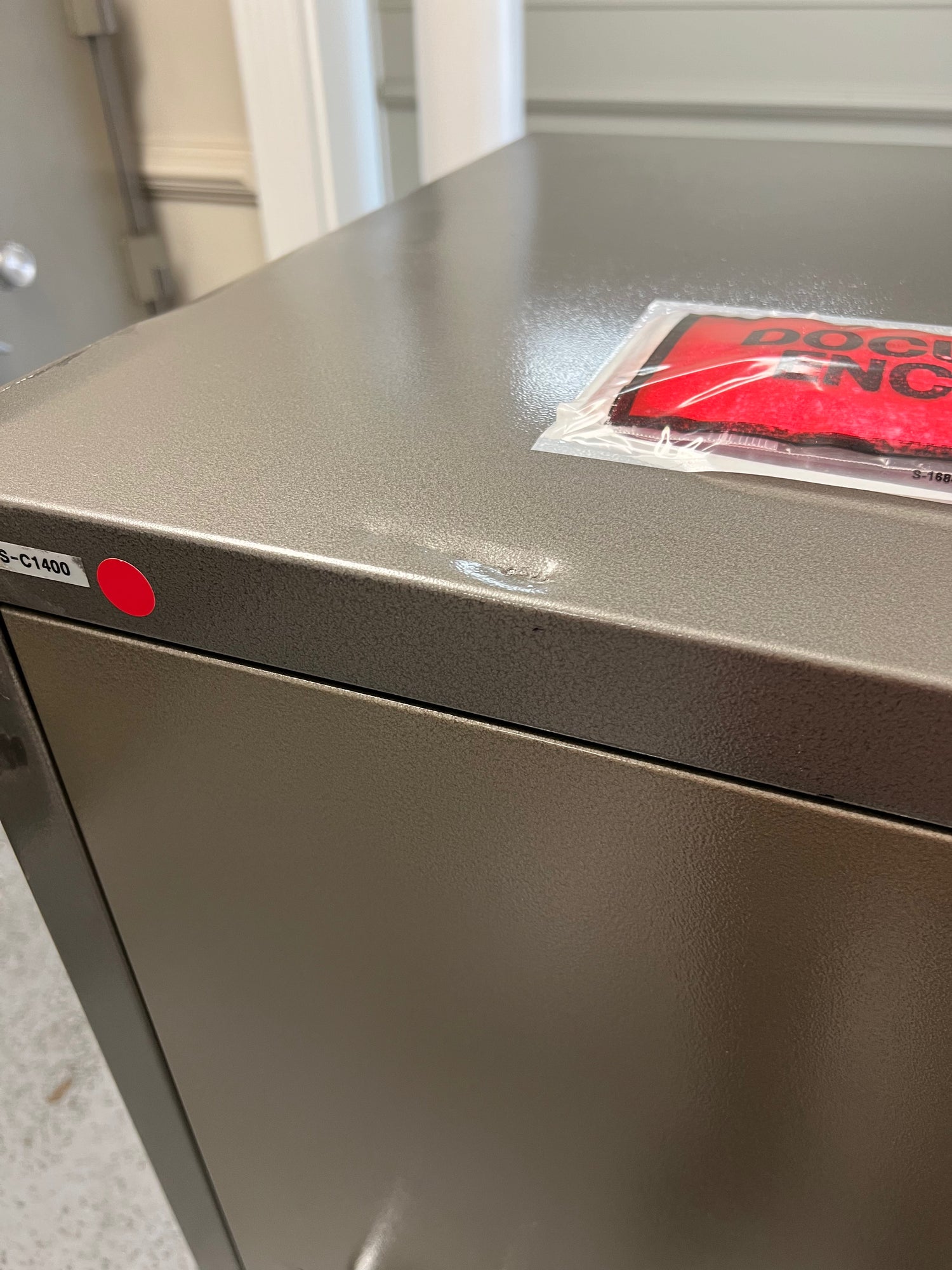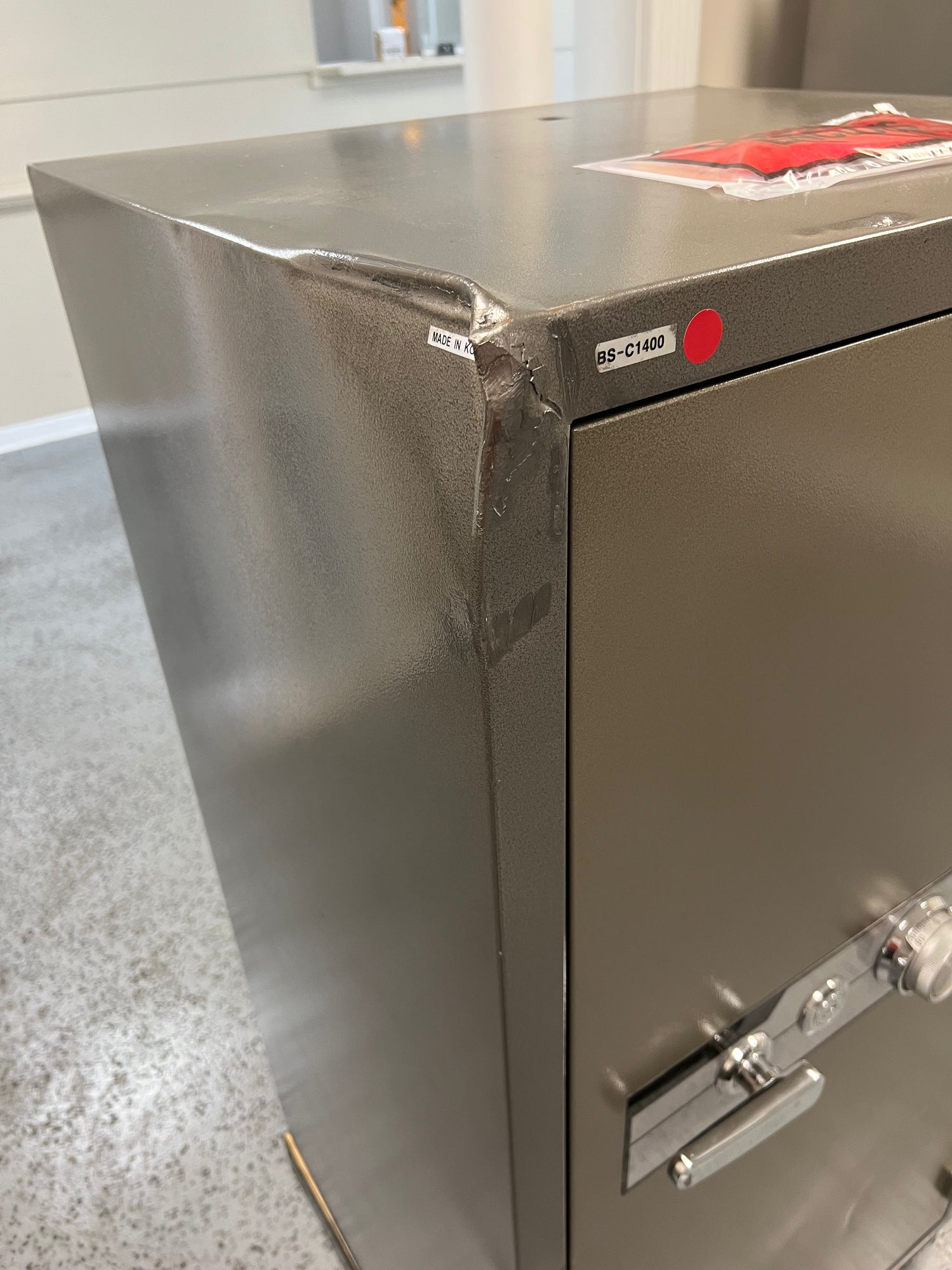 “RED ARROWS” will indicate the most noticeable dents/scratches on the exterior sides of the safe but please note that there may be some smaller imperfections that do not show up in pictures well and not pointed out with the “RED ARROWS”. The bottom of the safe may have scratches/dents due to moving the safe during inspection that will not affect the security, fireproofing, or integrity of the safe.