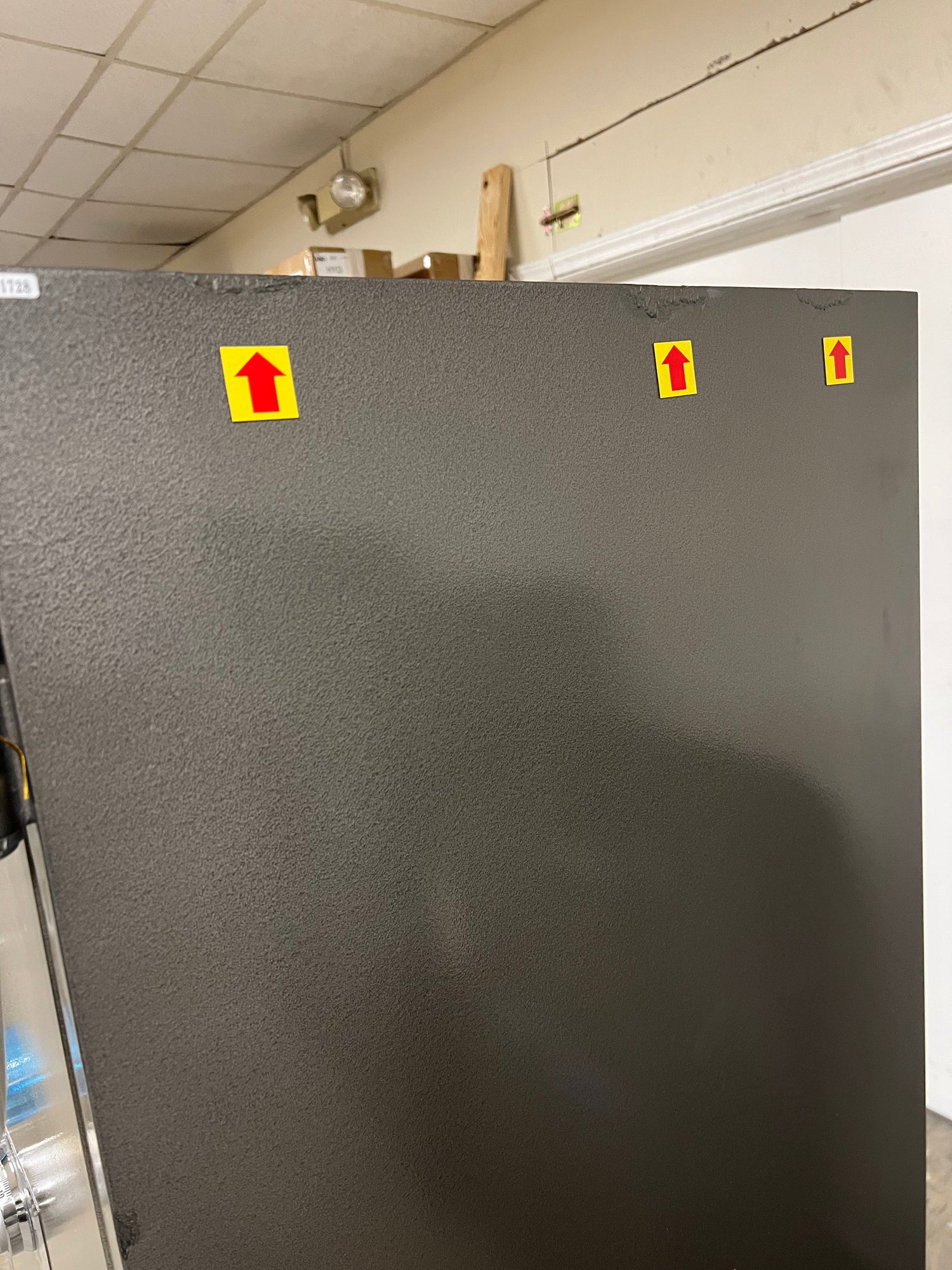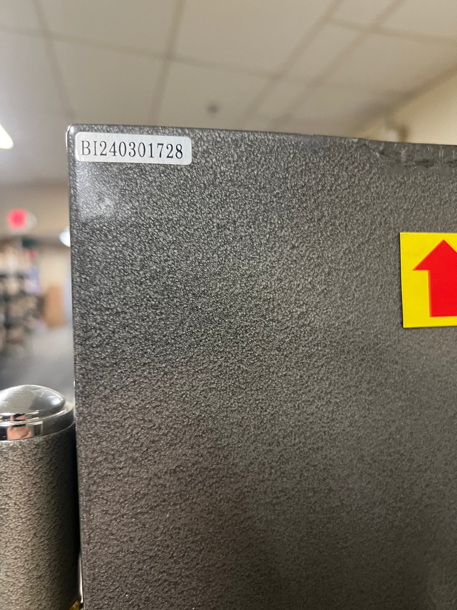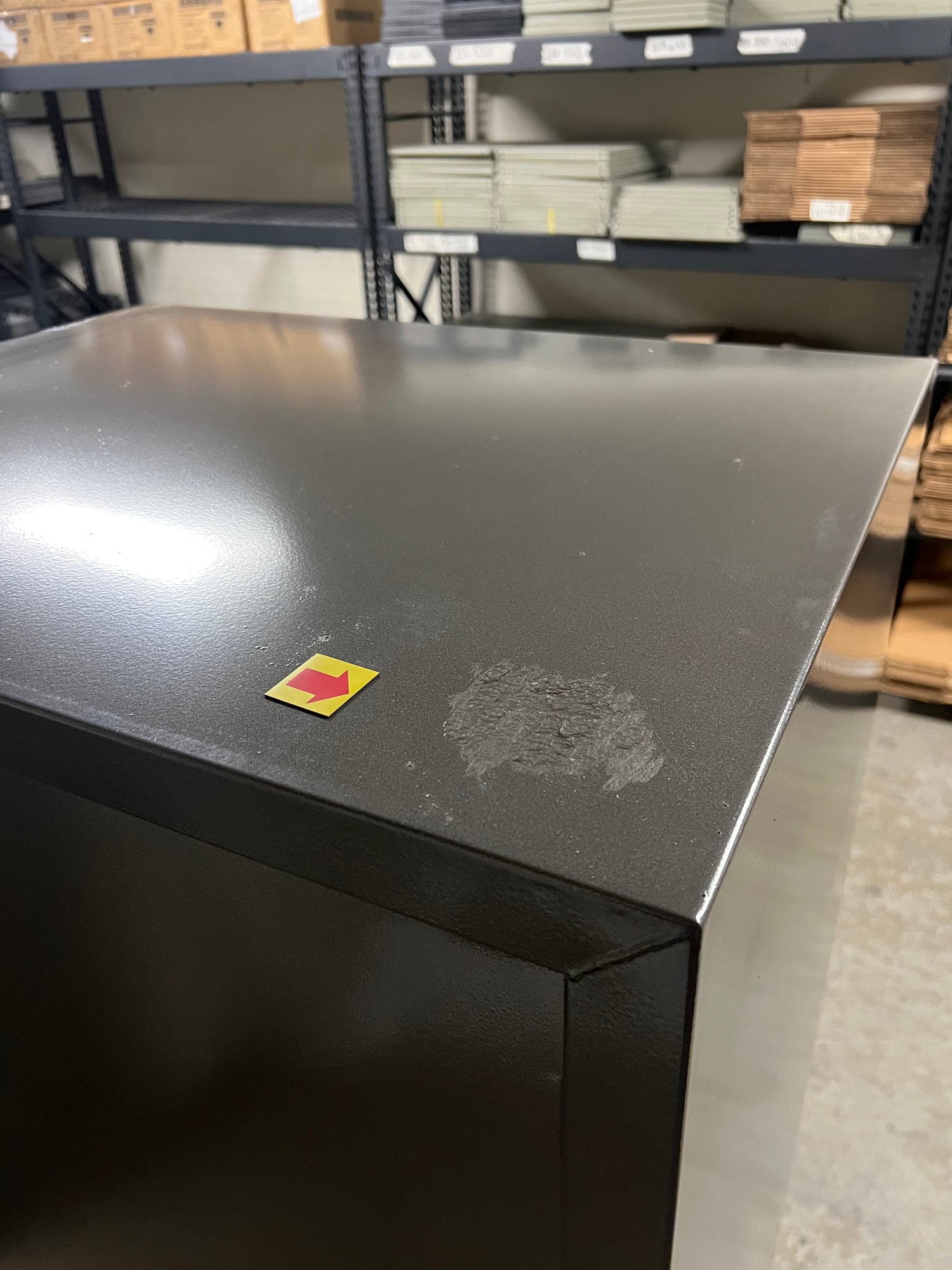 “RED ARROWS” will indicate the most noticeable dents/scratches on the exterior sides of the safe but please note that there may be some smaller imperfections that do not show up in pictures well and not pointed out with the “RED ARROWS”. The bottom of the safe may have scratches/dents due to moving the safe during inspection that will not affect the security, fireproofing, or integrity of the safe.